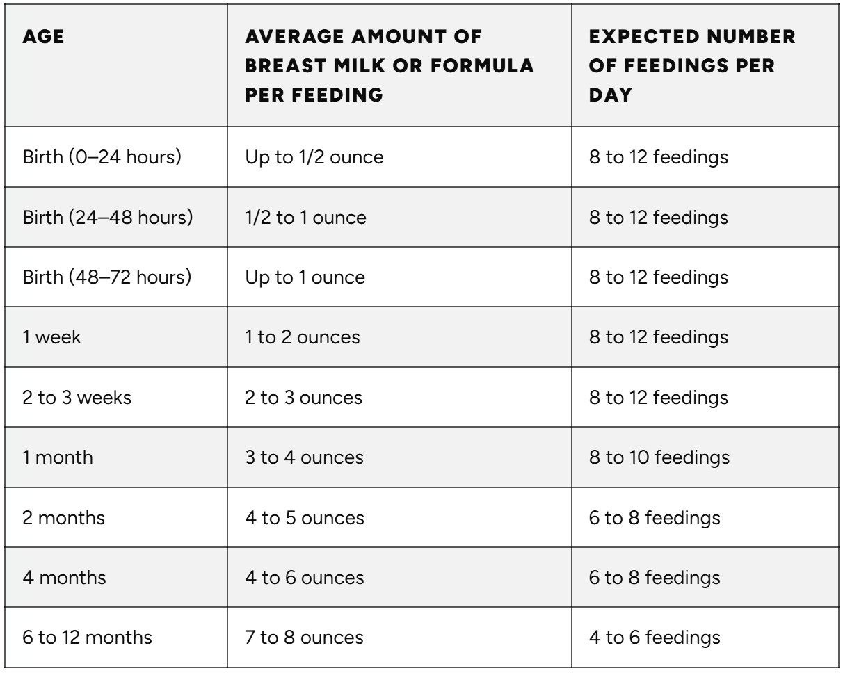 Breast Milk Consumption Newborns typically consume breast milk every two to three hours, averaging 1 to 2 ounces per feeding (American Academy of Pediatrics, 2024). As your infant reaches two weeks of age, this quantity will gradually increase. If you are utilizing a breast pump and bottle-feeding, you can easily monitor the volume of milk your baby consumes at each feeding. However, when nursing directly from the breast, accurately measuring your infant's intake may prove challenging, which is perfectly acceptable. A reliable method to assess your baby's consumption is by observing their output. It is indicative that your infant is adequately nourished if they wet their diaper two to three times daily during the initial days, increasing to five to six times daily after they reach four or five days of age.